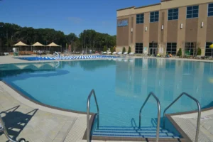 Life Time Fitness Gaithersburg in Maryland exemplifies luxury athletic club amenities with an extensive aquatic complex totaling over 16,000 square feet of pool and spa space. Completed in 2016, this comprehensive facility features both indoor and outdoor lap pools, leisure pools, and spa areas—creating year-round aquatic options that cater to every member’s needs, from serious lap swimmers and fitness enthusiasts to families seeking recreation and relaxation.
